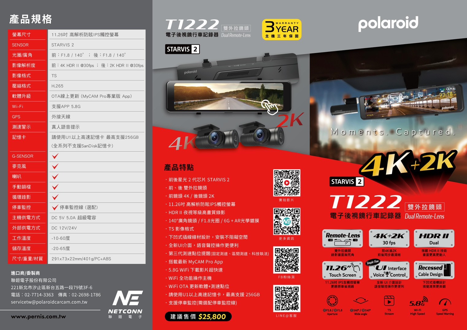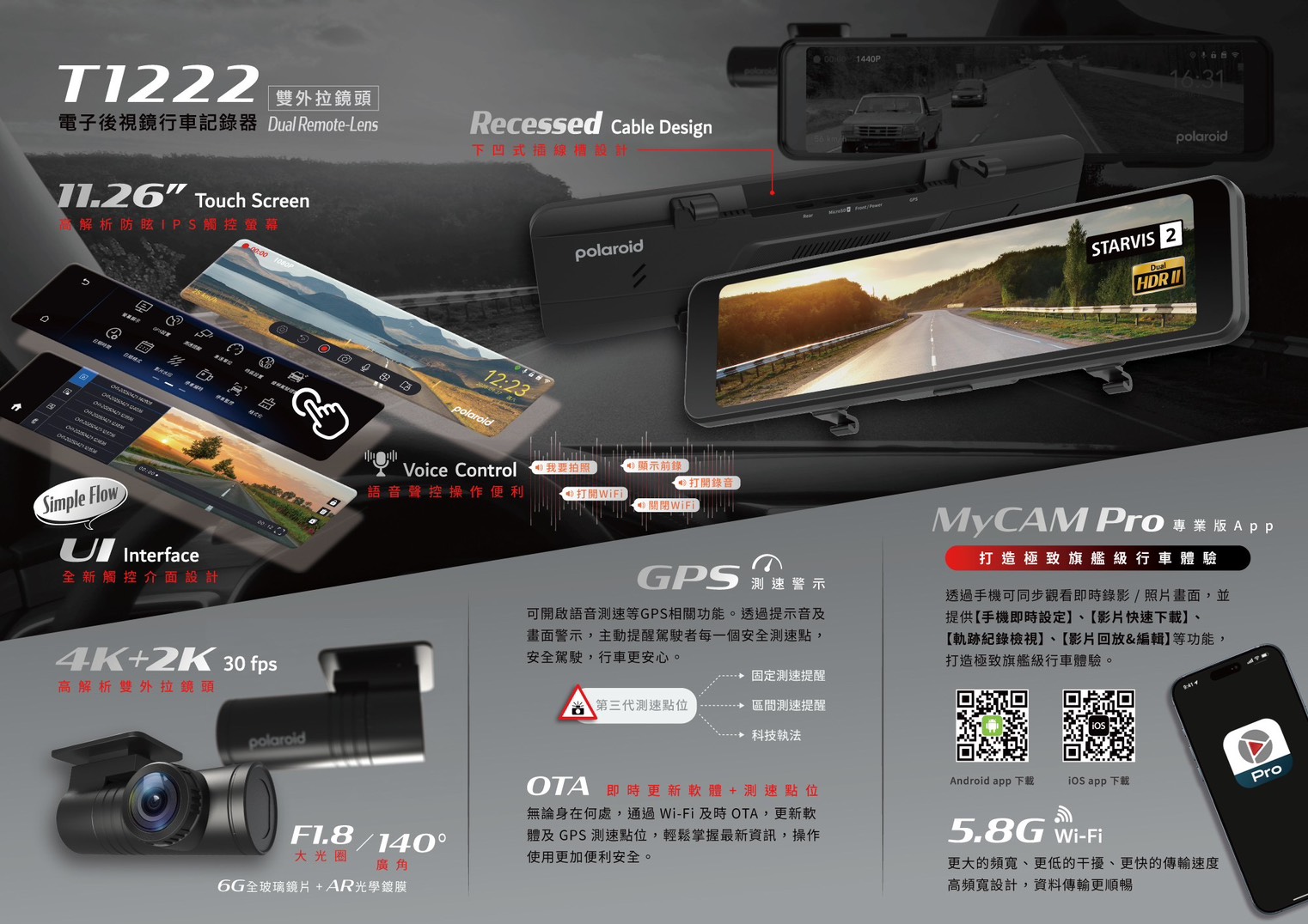 T1222 為雙外拉鏡頭電子後視鏡機種,前後皆採用 STARVIS 2 感光配置, 搭配 11.26 吋高解析防眩 IPS 觸控螢幕、5.8G Wi-Fi 與 OTA 更新功能, 適合高階影像記錄與電子後視鏡升級需求。